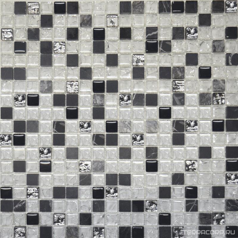 Мозаика Мастера Керамики коллекция Glass & Stone Мозаика Glass & Stone 2026 микс мрамор черный-черный-белый кол-платина (чип 15х15мм) ZZ|30x30 Комбинированный