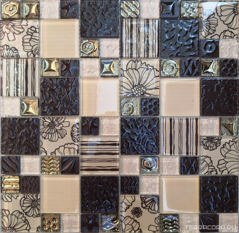Мозаика Мастера Керамики Glass Мозаика 2168 микс молочный с рис. цветы-мол.риф.верх-золото с рисунком-шоколад рис.верх-молочный ZZ30х30 Комбинированный