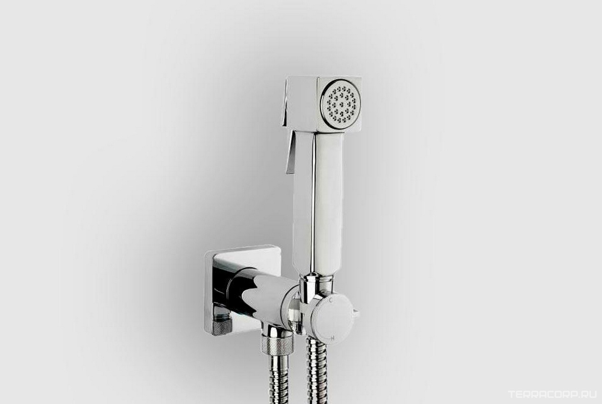 Смеситель совмещённый с гигиеническим душем, квадратн., (готовый комплект: лейка пластик ABS, шланг 125см., скрытая часть), (цв.хром), Cube Brass ZZ