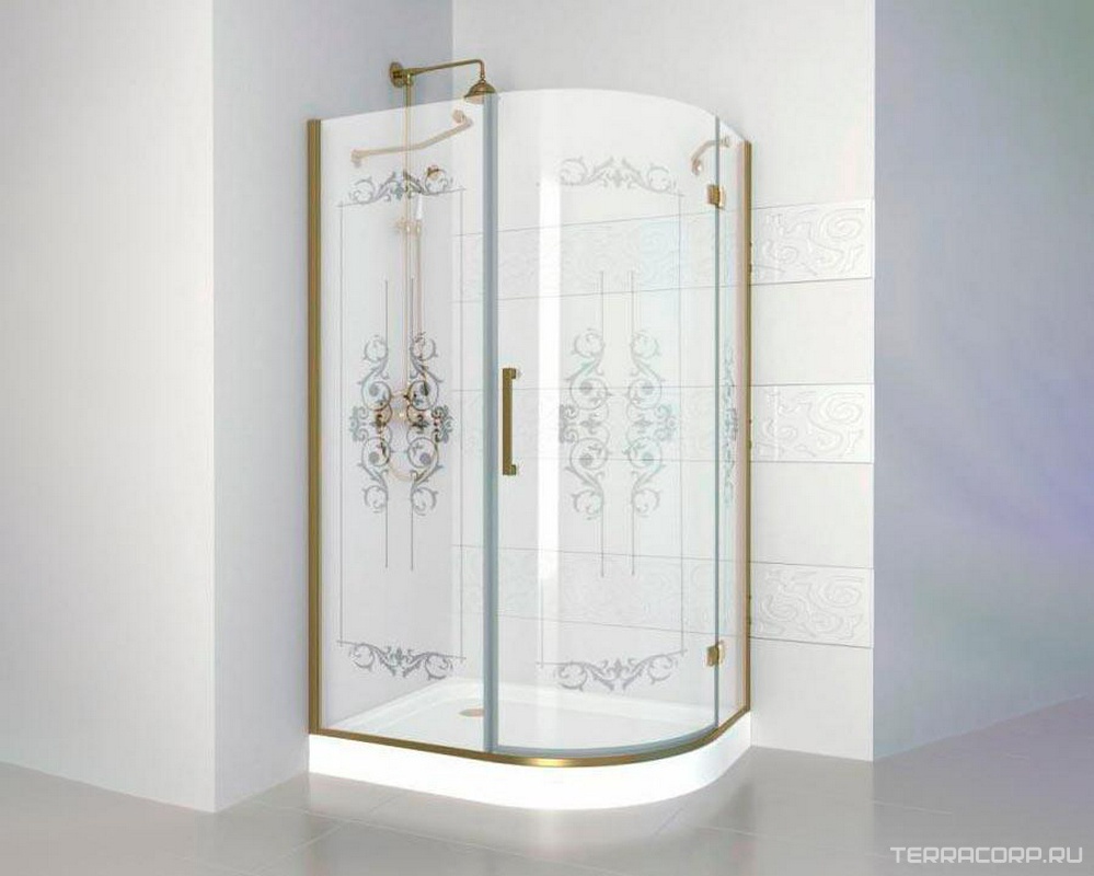 Душ.угол.1200х900хh1950мм,R550,ассиметрич, "Правая" (петли слева),вход 730мм,(стек.8мм, матов.с прозр.рис, фурн. цв.зол.),Magic-RP ZZ