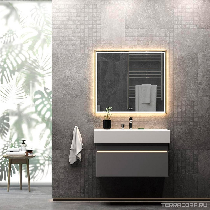 Зеркало TECNO 90, c LED с подсветкой, с функцией антизапотевание и часами, белый глянцевый