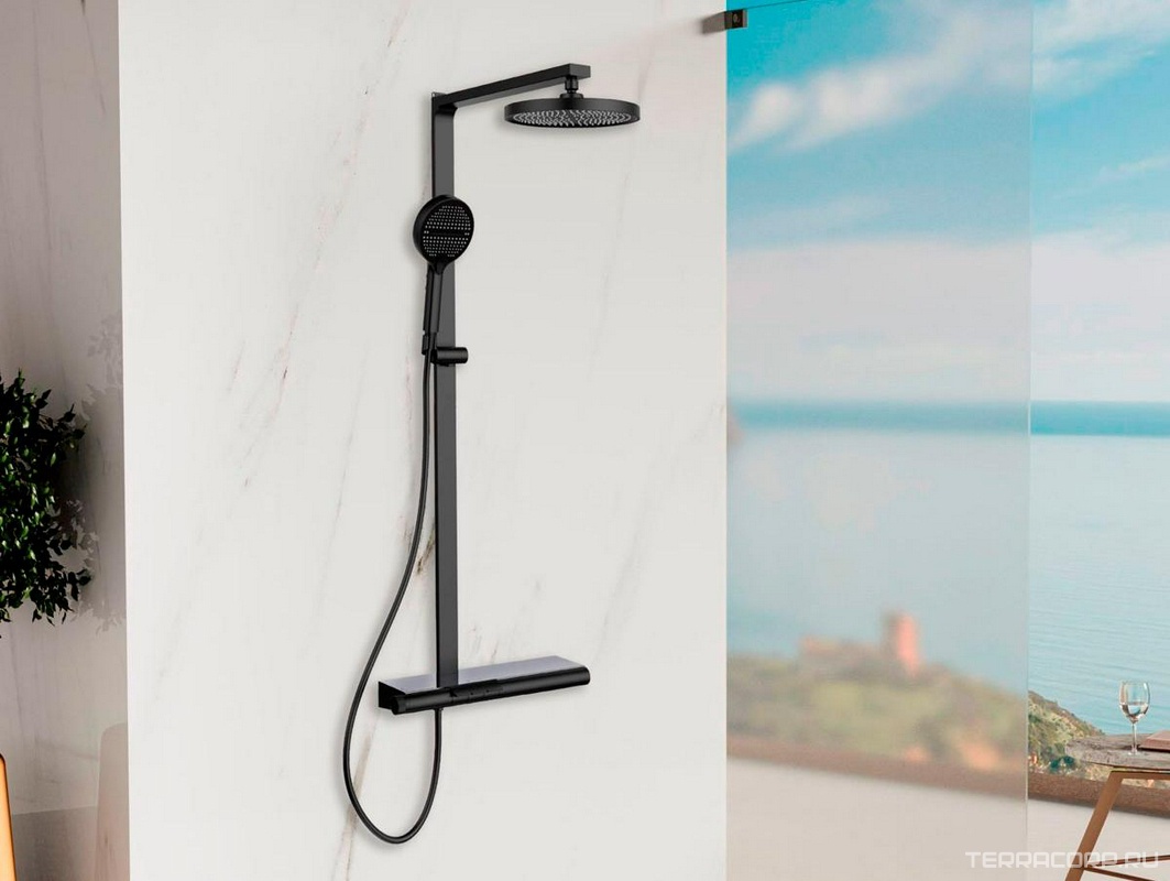 Смеситель для ванны (душа), со стационарным верхн.душем 26см., душевая лейка, шланг в компл., (цв.черный матовый), Aspire ZZ