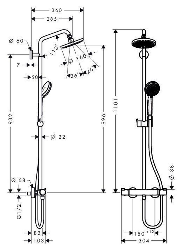 Душевая система Croma Showerpipe 160 (смеситель+шланг+штанга+ручной душ+верхний душ), хром ZZ