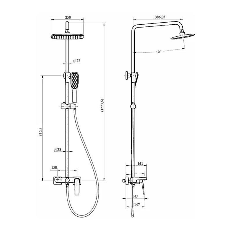 Душевой гарнитур со смесителем для ванны/душа, верхний душ 250мм, душ лейка, душ.шланг 150 cм, хром ZZ