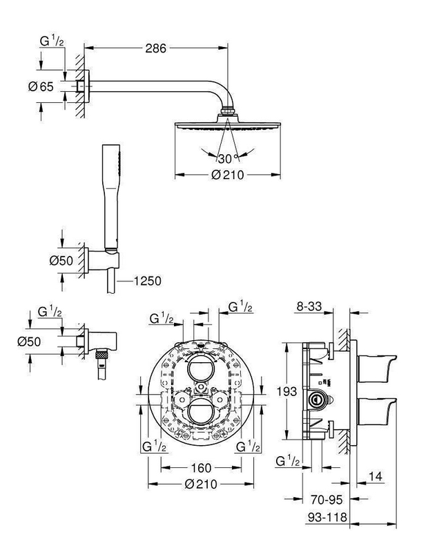 Душевой набор (верх.душ 210мм, стенов.кронштейн, ручной душ, шланг,держатель/шланг.подсоед, смес.термост. внешн/внутр. часть), Grohtherm 2000 XX