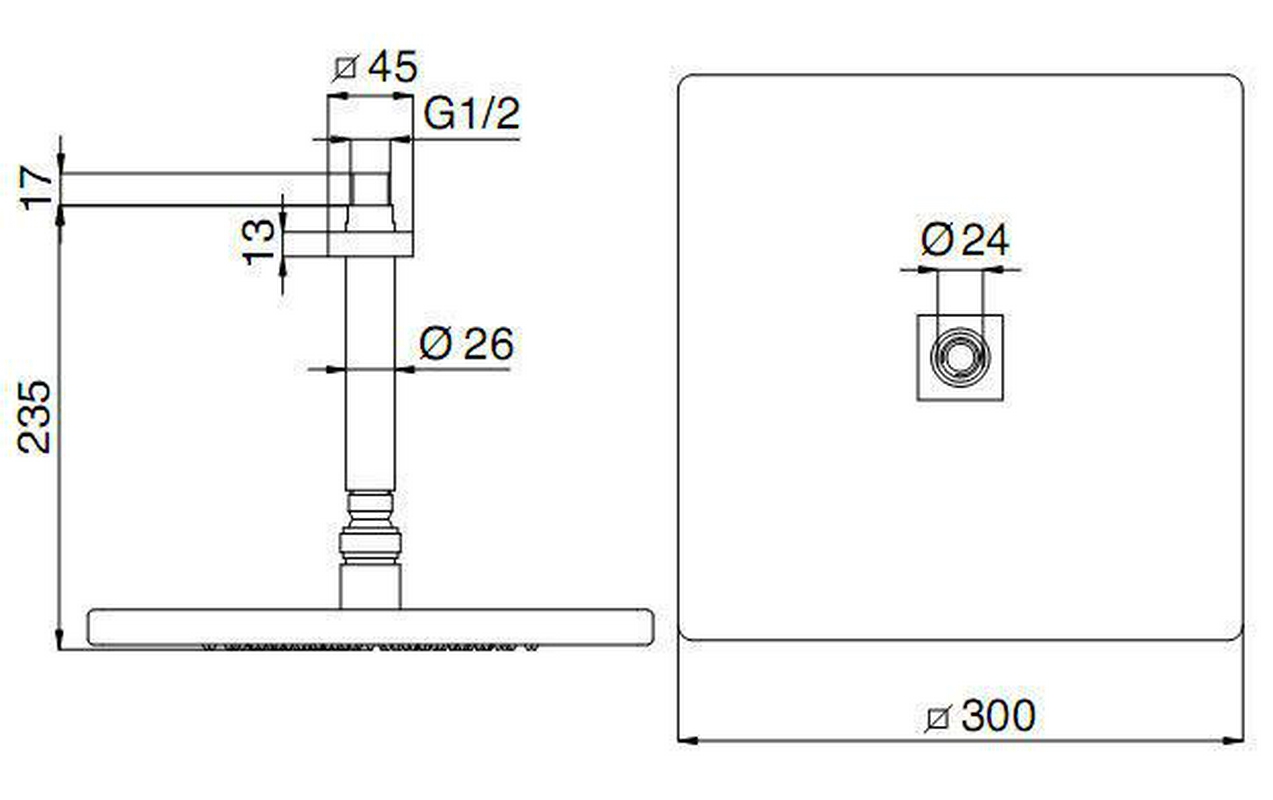 Душ верхний, стационарный, (квадр. 300х300мм) с потолочным кронштейном 235мм, декор накладка в компл., (цв. brush nikel), 3М ZZ