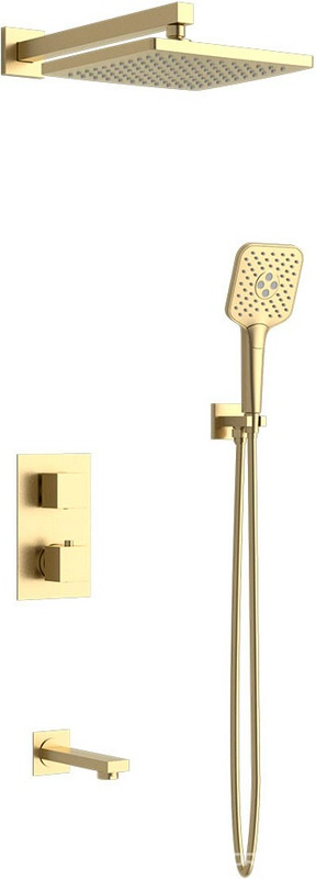 Душевой к-т: смес-термостат встр.в стену, верхний душ 255х255мм, ручн.душ, шланг, кронштейн совмещ. со шланг.подсоед., излив,(цв.браш.золото)Vincea ZZ