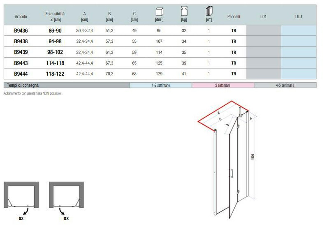 Дверь в нишу 94-98xh190см, (вход 55см) петли двери и непод.сегм слева (профиль цв. хром, стекло прозрачное StarClean), ZZ Samo Polaris Design B9438 ULU AS SX DF