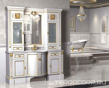 Тумба напольная 135х59хh83см,2 выдвиж. ящика,(под раков./столеш.)(цв. Bianco Laccato,фасад и пугов.-экол.кожа цв.Bianco,фурнит.цв.зол.)Trendy DeluxeZZ
