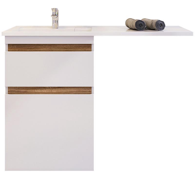 Тумба подвесная 90 см, правая, 2 выдвижных ящика + полки, без раковины, цв.белый матовый/орех