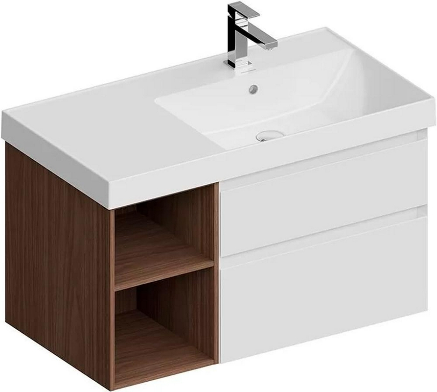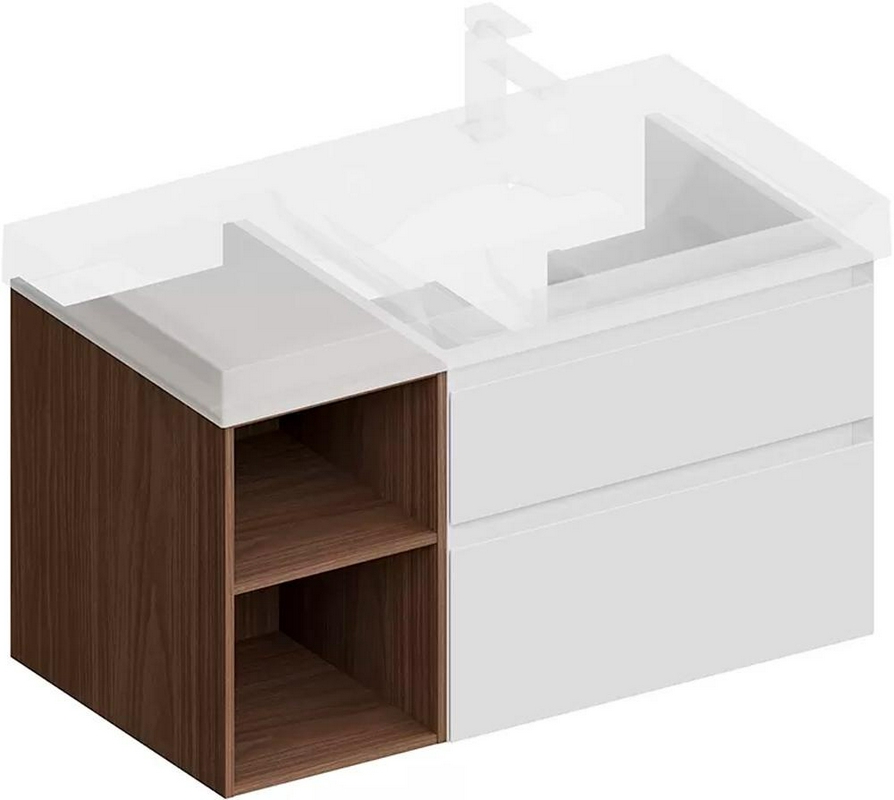 Тумба подвесная 90 см, правая, 2 выдвижных ящика + полки, без раковины, цв.белый матовый/орех