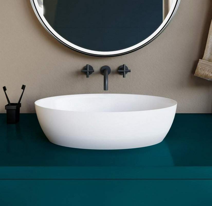 Раковина накладная овальная 580х350х150мм, без отв.д/смесителя, перелива, без донного клапана, литой камень S-Stone матовый цв.белый, Alda ZZ