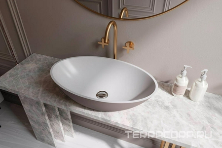 Раковина накладная 590х355х165мм, без отверст. для смесит., без перелива, д/к в цвет раковины в компл.,(иск.камень Soft rock цв.белый мат), Dione ZZ