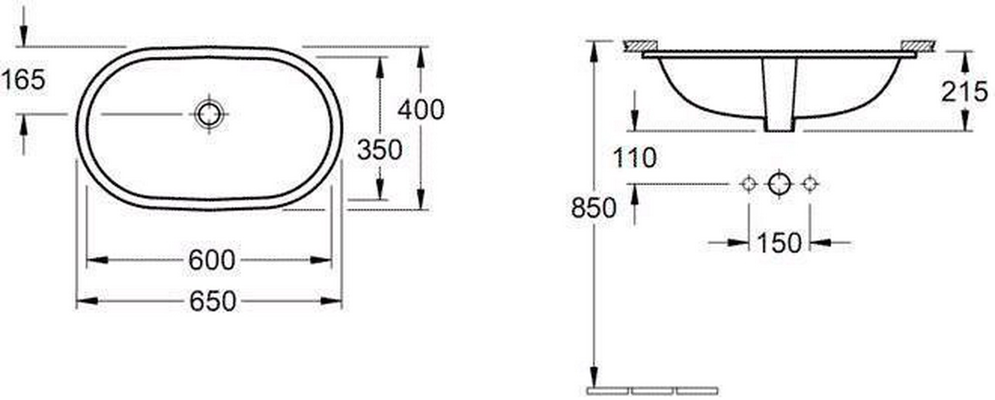 Раковина для установки под столешницу, овальная 620(545)х410(335)хh175мм, без отв. д/смес., с переливом, шаблон, крепёж в комп., Connect ZZ