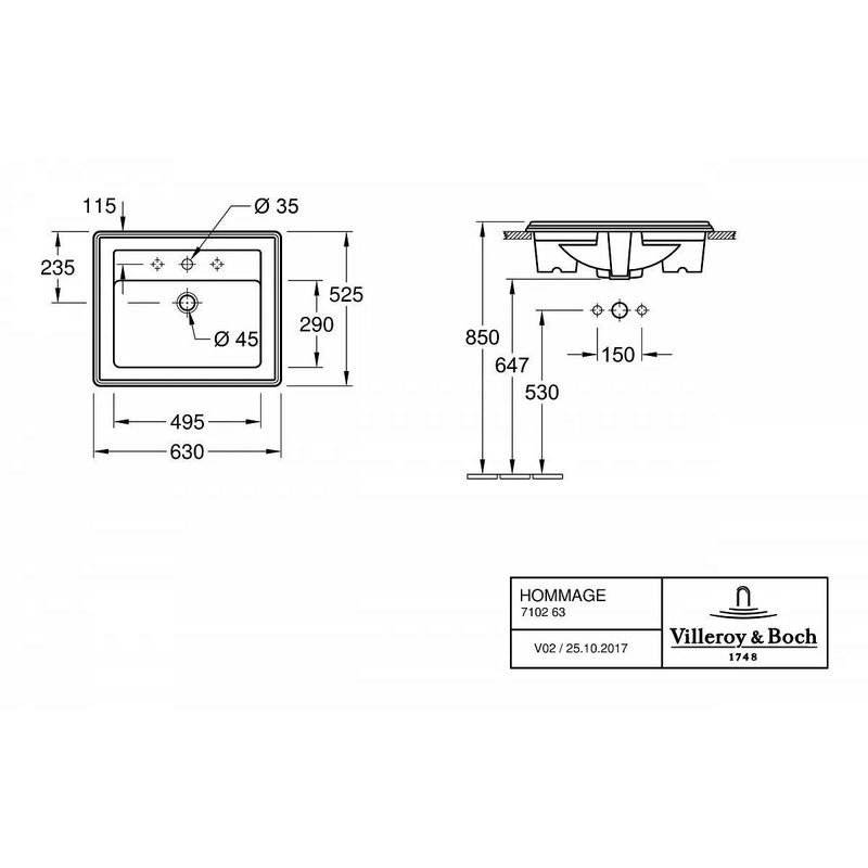 Раковина встраиваемая 630х525 мм, 3 отв. д/смес., (R2 Star white ceramicplus), Hommage ZZ