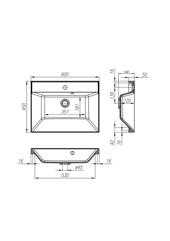 Раковина 600х450мм, с 1 отв.для смесителя, с переливом, (искусственный мрамор, цв.белый), BelBagno ZZ