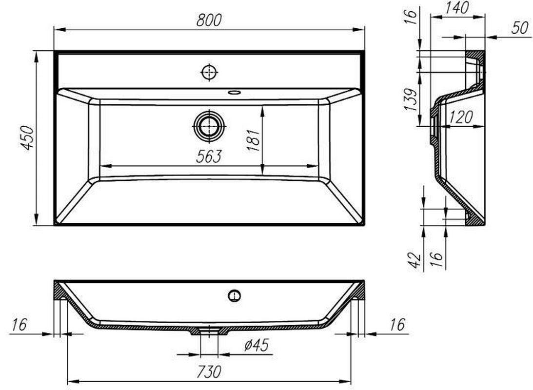 Раковина 800х450хh50(140)мм, (искусственный мрамор, цв.белый), с переливом, без сифона, BelBagno ZZ