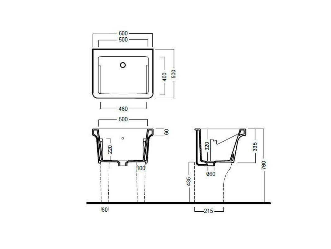 Раковина хозяйственная 60х50см, без отв. для смесителя, с переливом, для установки на 2 ножки, без сифона, Specials, Hatria ZZ