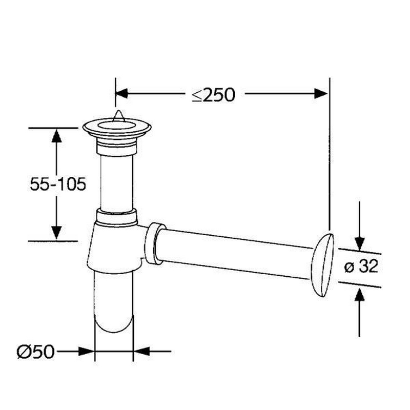 Бутылочный сифон для раковины G1 1/4*32 мм с отводной трубой 32*200 мм, отражателем и универсальным клапаном из латуни, хром XX