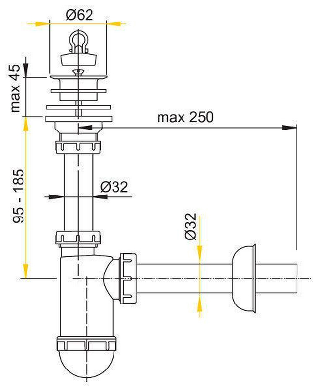 Сифон для умывальника диаметр 32 с нержавеющей решёткой диаметр 63 мм