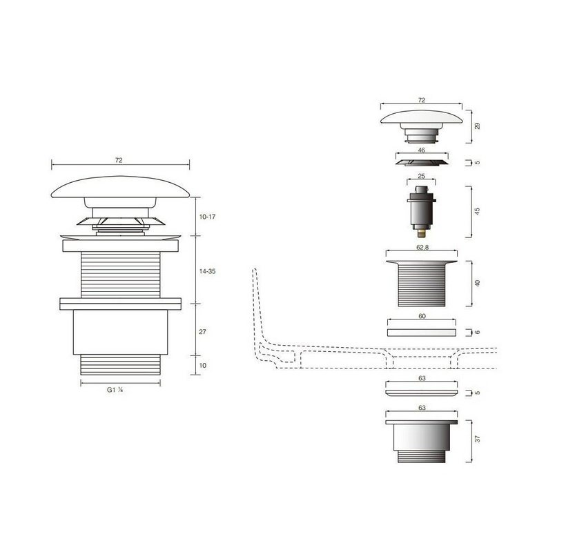 Пробка для сливного отверстия раковины, нажимная, "Click-Clack", G 1 1/4, для раковины / биде, (цв.чёрный мат./ Gloss White), Ceramica Cielo ZZ