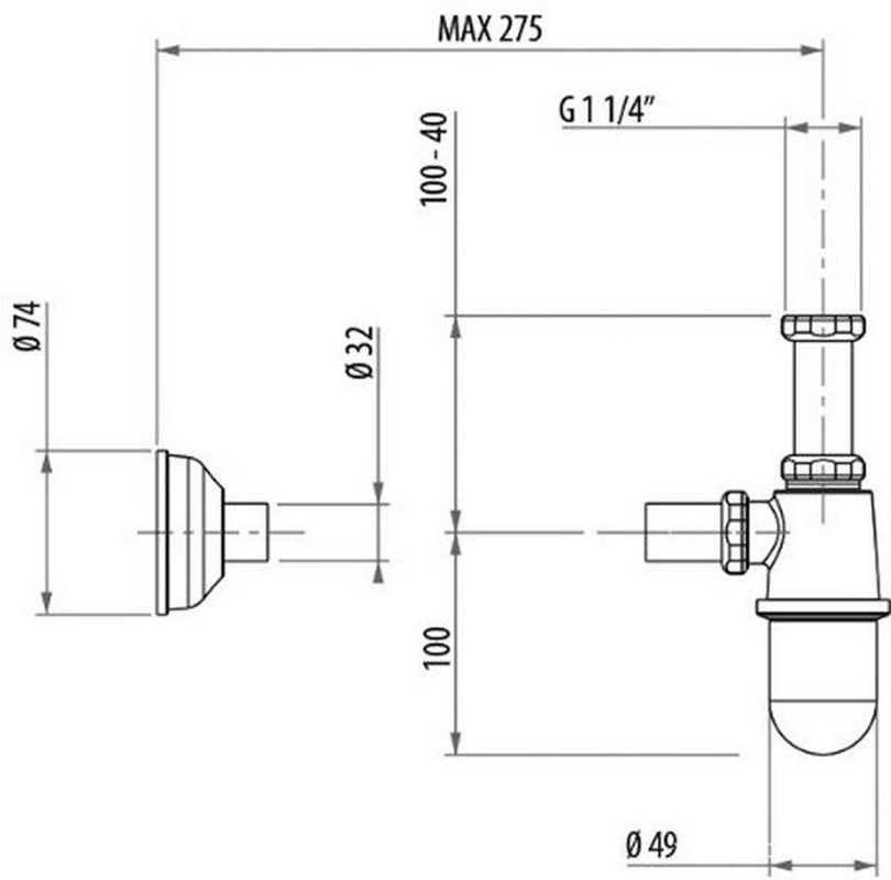 Сифон-стакан для раковины, 1 1/4, горизонтальная часть 275мм, (металл цв.бронза), Gattoni ZZ