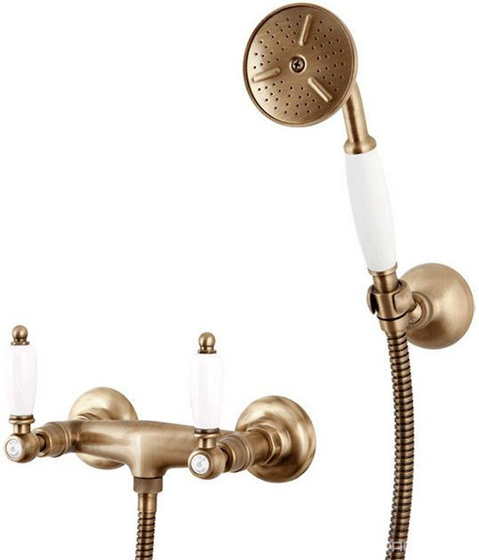 Смеситель для душа, шланг, лейка, кронштейн в компл., (цв. бронза, ручки белые), First ZZ