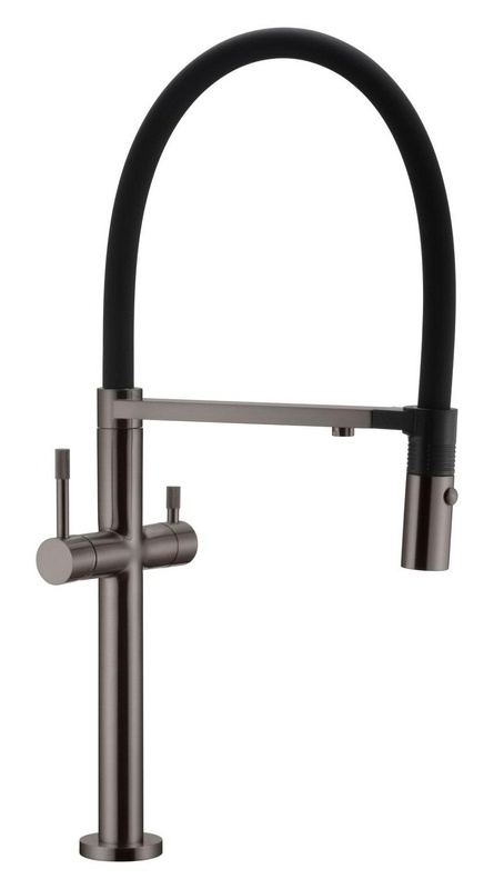 Смеситель для кухонной мойки Uno gun metall, гибкий излив цв. черный, встр. кран для питьевой, корпус темный хром матовый, ZZ