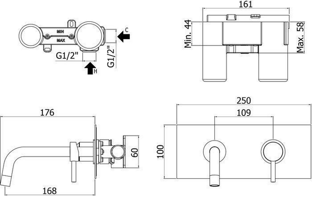 Смеситель для раковины, настенный, излив 175мм, накладка 250х100мм, встраиваемая часть в компл., без д/к, (цв.хром), Light ZZ