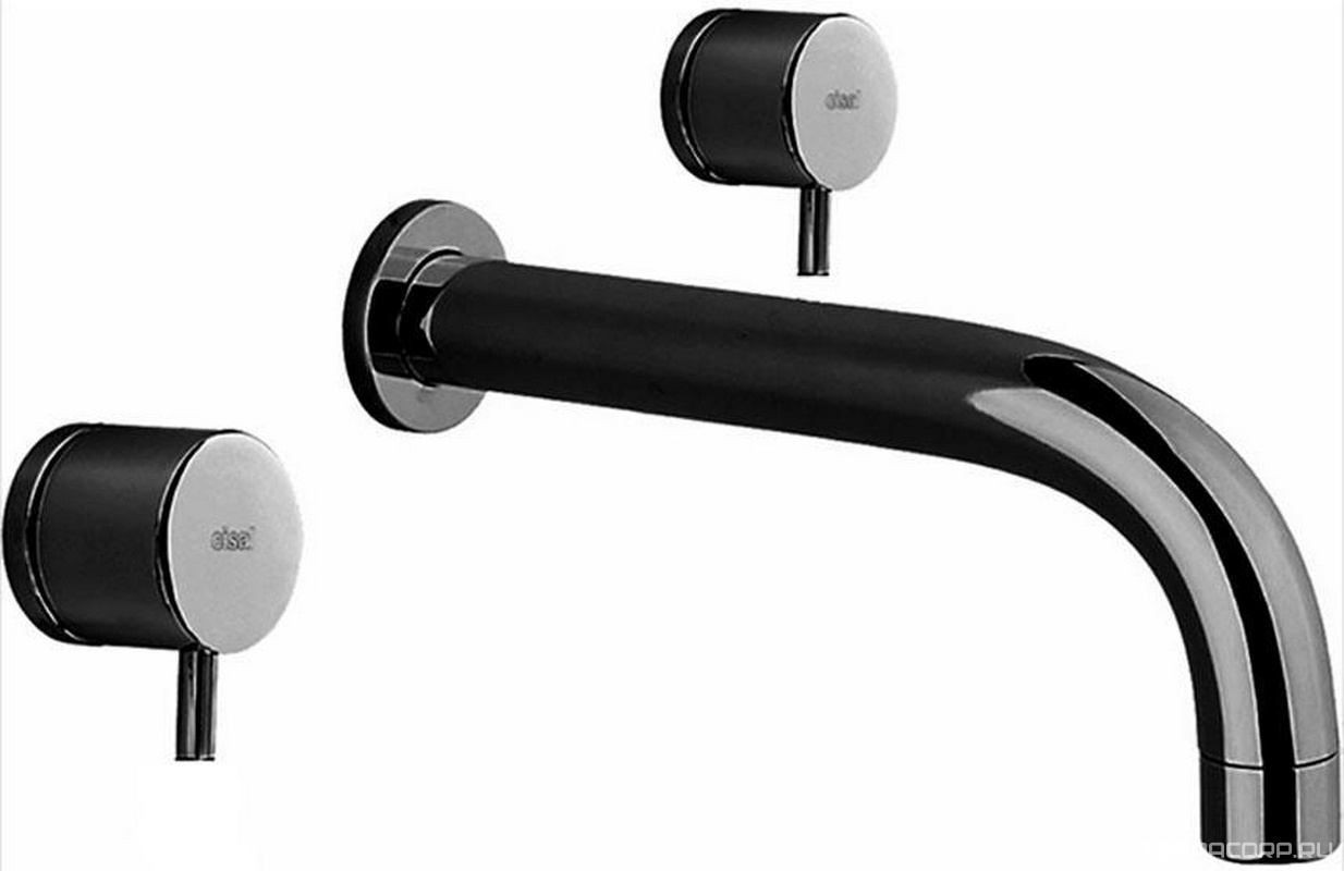 Смеситель для раковины на 2 отверстия, настенный монтаж, внутр. часть в комплекте, цв.черный