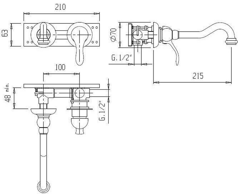Смеситель для раковины, встраиваемый в стену, излив 215мм, (цв.хром, ручки пластик цв.белый), Margot ZZ