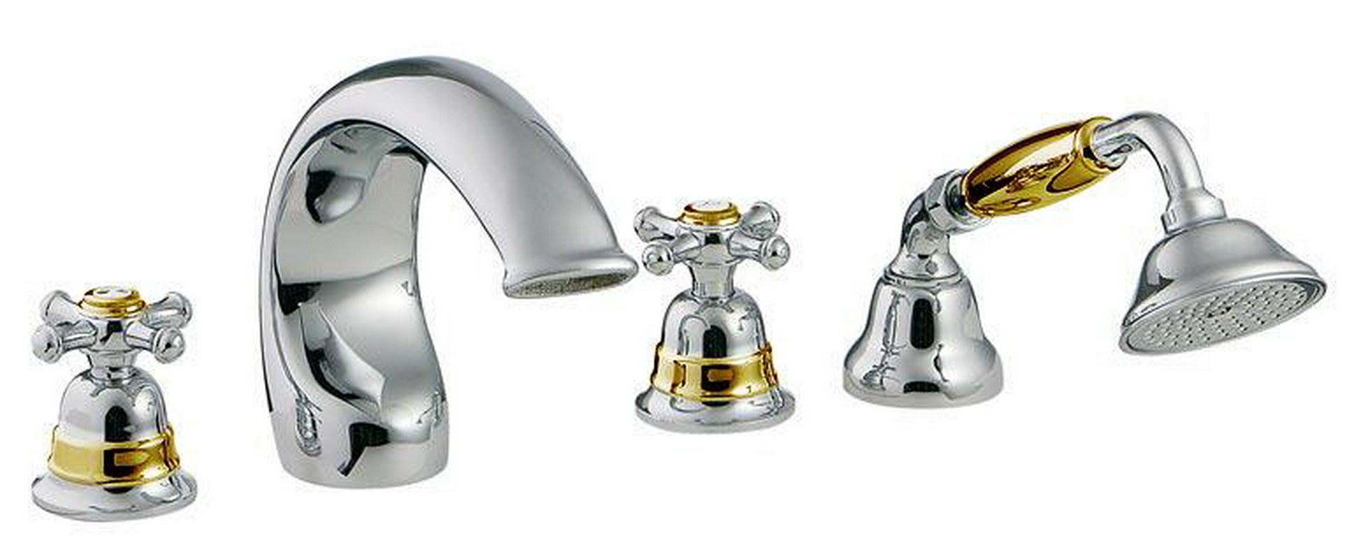 Смеситель для ванны, встраиваемый в борт ванны с душ. гарн., высокий излив на 4 отв. (хром/золото) Old italy ZZ