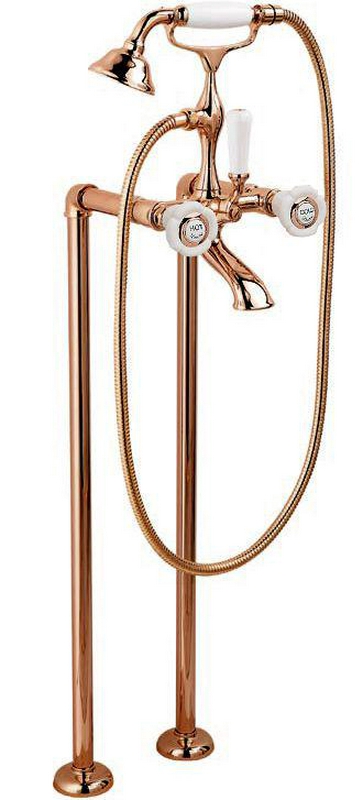 Смеситель для ванны, напольный, трубы 2шт., крепёж к сифону, лейка, шланг, кронштейн в компл., (цв. бронза, ручка цв. белый), Canterbury ZZ