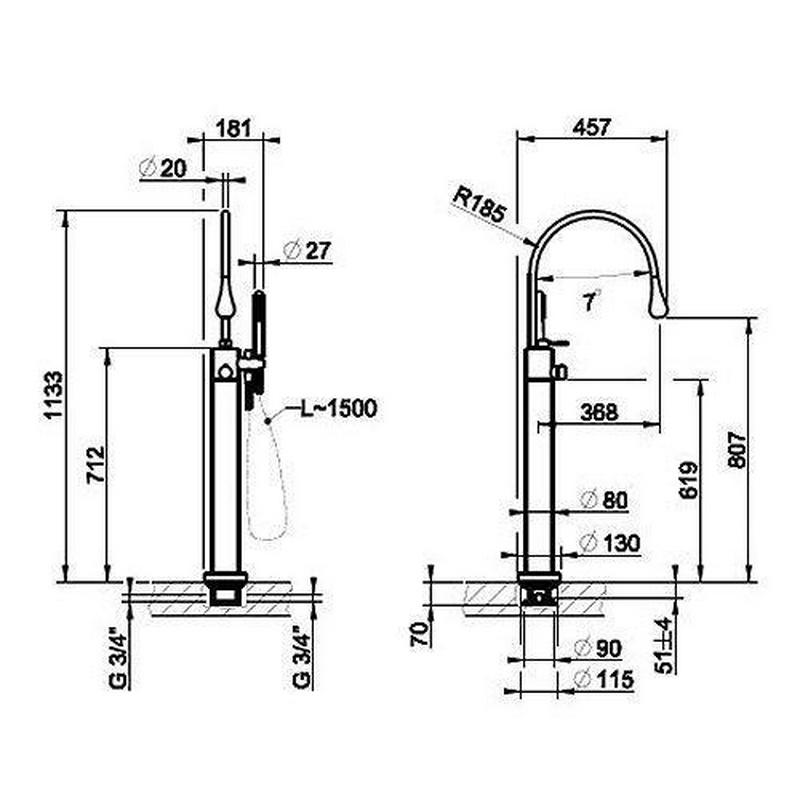 Смеситель для ванны, напольный, с душевой лейкой и шлангом, БЕЗ встраиваемой части арт.24997 031, (цв. хром шлифован.), Goccia ZZ