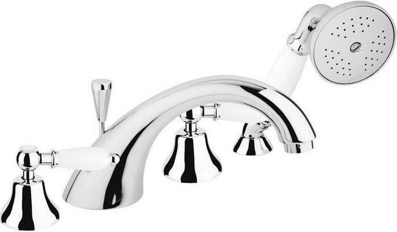 Смеситель для ванны, врезной на борт, на 4 отв., шланг, лейка в компл., (цв. хром, ручки белые), First ZZ