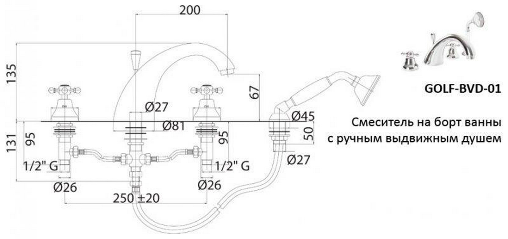 Смеситель для ванны, встраиваемый в борт, на 4 отв., лейка, шланг в компл., (цв. хром), Golf ZZ