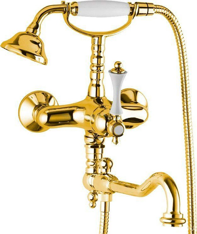 Смеситель для ванны с душевым гарнитуром (лейка, шланг) и поворотным изливом, (цв.золото, ручка цв.белый), Margot ZZ