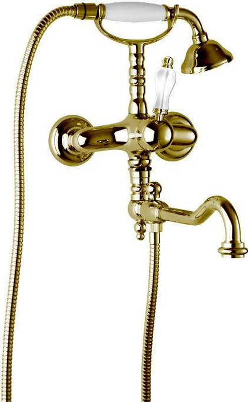 Смеситель для ванны с душевым гарнитуром (лейка, шланг) и поворотным изливом, (цв.золото, ручка цв.белый), Venezia ZZ