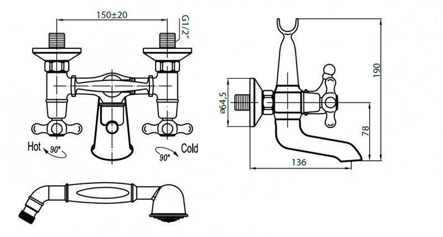 Смеситель для ванны, душевая лейка, шланг в компл., (цв.хром), Retro ZZ