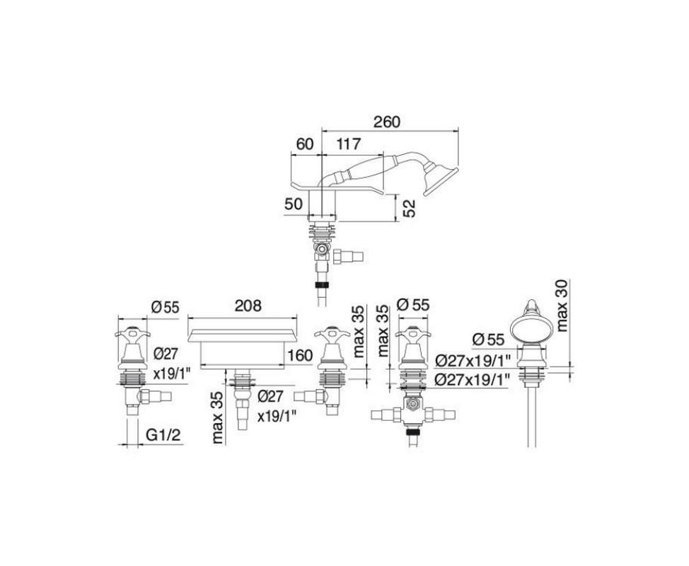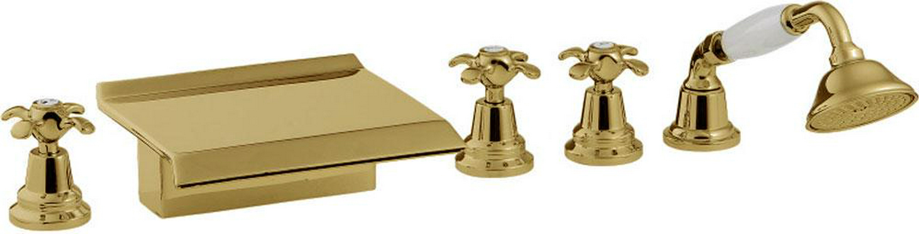 Смеситель для ванны, встраиваемый в борт ванны на 5 отв., излив каскад, с душ. гарнитуром, (цв.золото), Nuova Retro ZZ