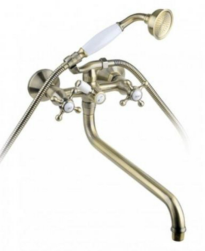 Смеситель для ванны/душа, длинный излив 350 мм, с установочным комплектом, аксессуарами, бронза XX