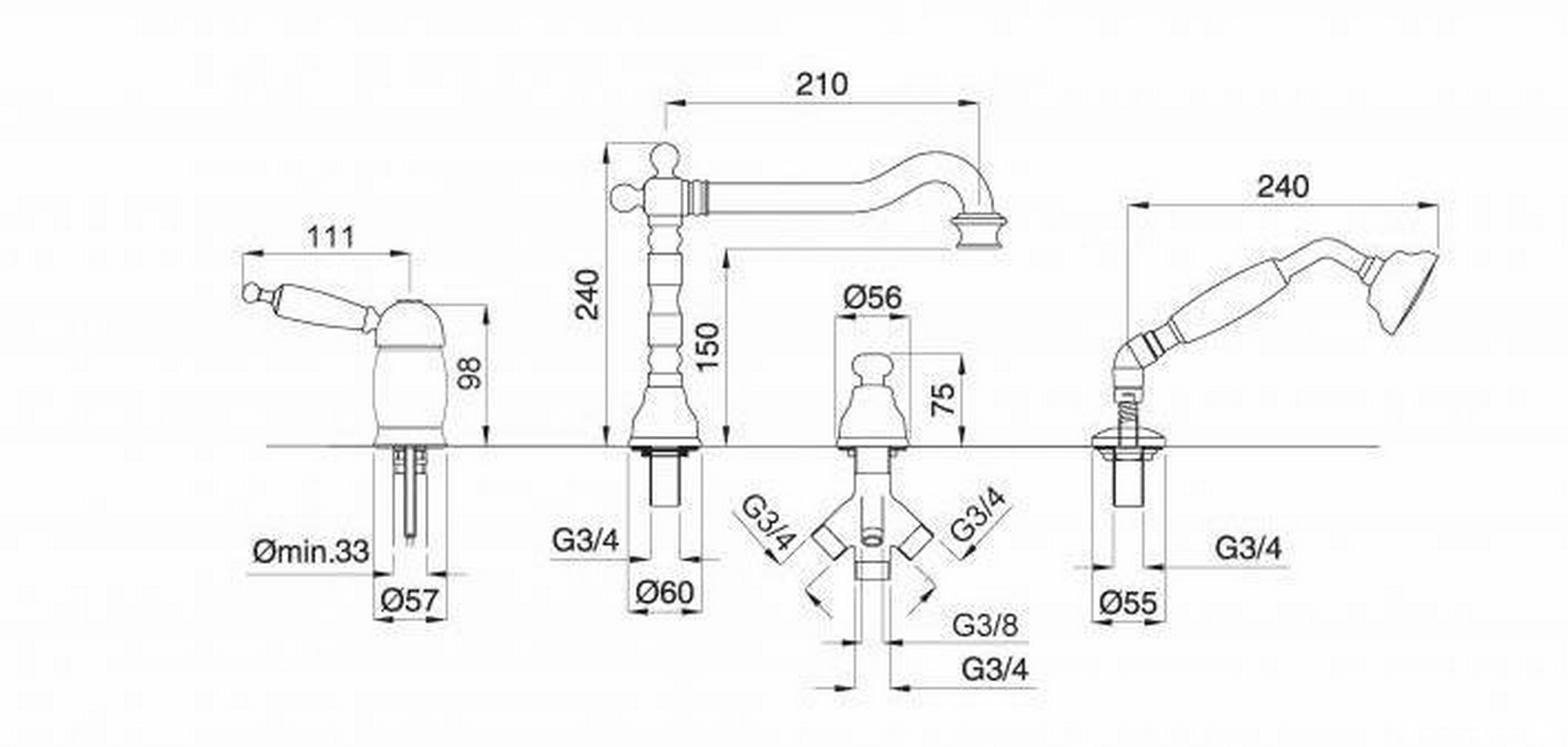 Смеситель для ванны, встраиваемый в борт, на 4 отв., лейка, шланг, встр.часть в компл., (цв.хром, ручка пластик цв.белый), Oxford ZZ