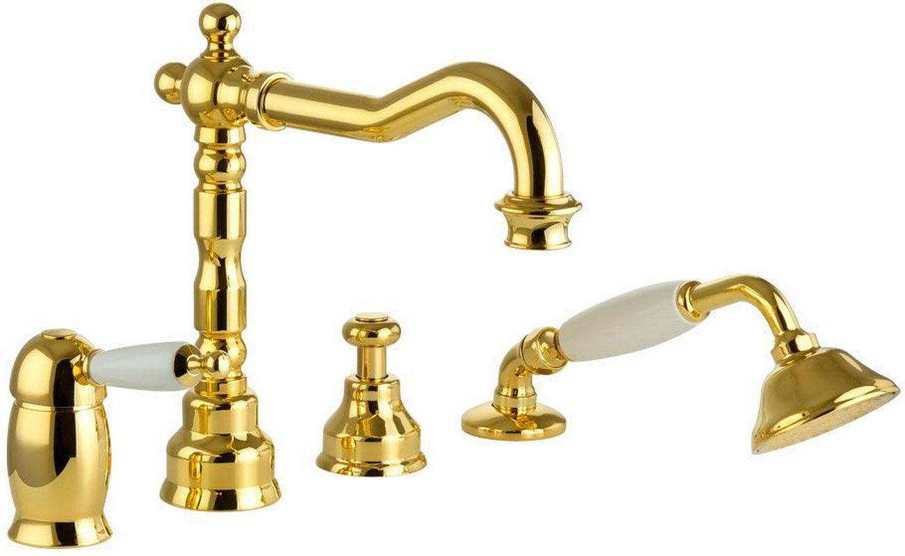Смеситель для ванны, встраиваемый, на 4 отв., лейка, шланг в компл., (цв. золото, ручка цв. белый), Canterbury ZZ