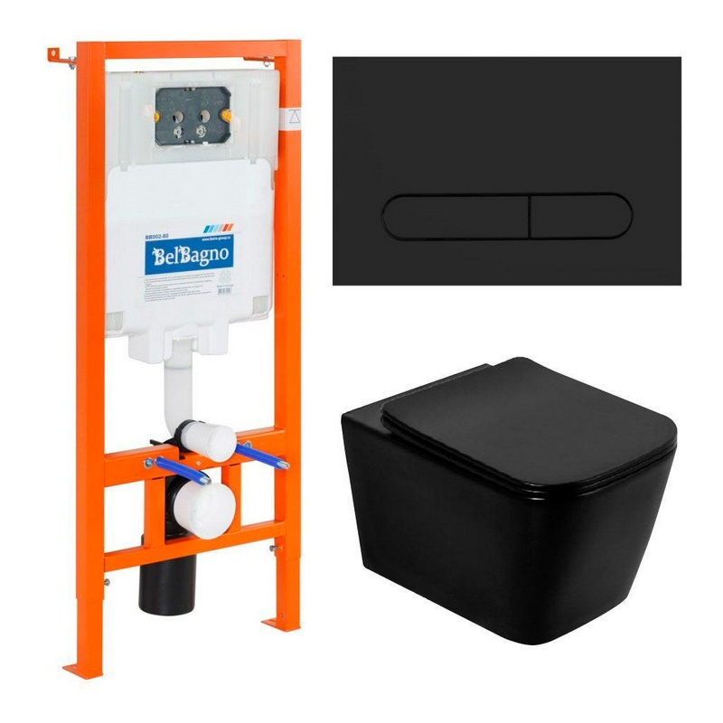 Комплект: унитаз подвесной безободковый, сиденье с микролифтом, инсталляция для подв.унитаза, крепёж, клавиша смыва, цв.черный матовый, Ardente-C ZZ