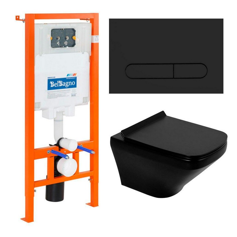Комплект: унитаз подвесной безободковый, сиденье с микролифтом, инсталляция для подв.унитаза, крепёж, клавиша смыва, цв.черный матовый, Sela ZZ