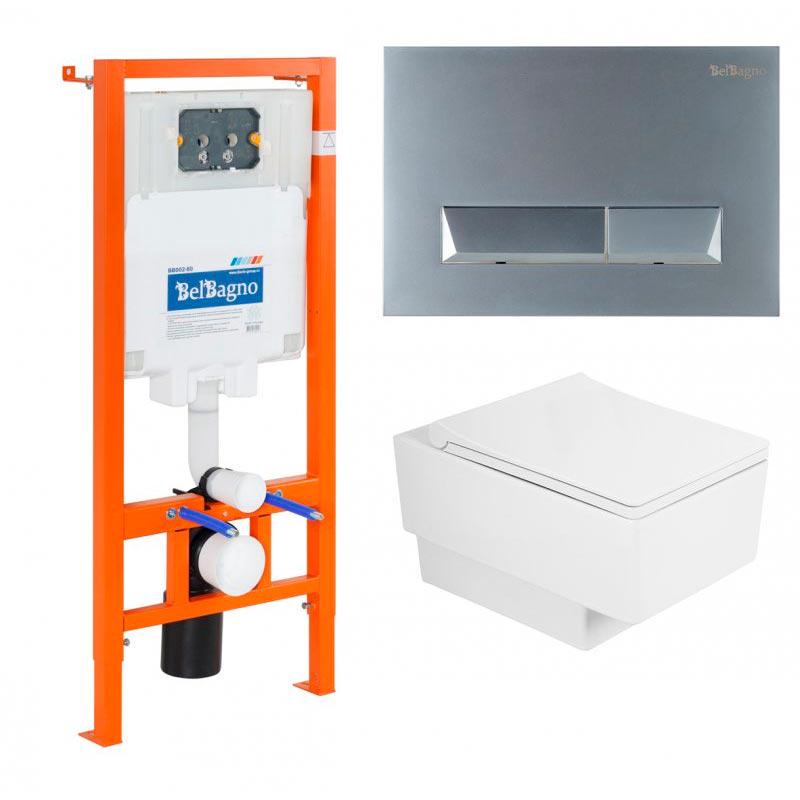 Комплект: унитаз подвесной безободковый, сиденье с микролифтом, инсталляция для подв.унит,крепёж,клавиша смыва цв.хром мат., Belbagno+Cezares Cadro ZZ