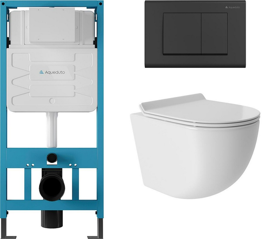 Компл.: унитаз подв.,безободк,Tornado 490х360мм,цв.белый гл.,сиденье с микролиф,,инстал. д/унит., крепёж, клавиша смыва Quadrado цв.черный мат, ZZ Aqueduto Ovo AQDS013T
