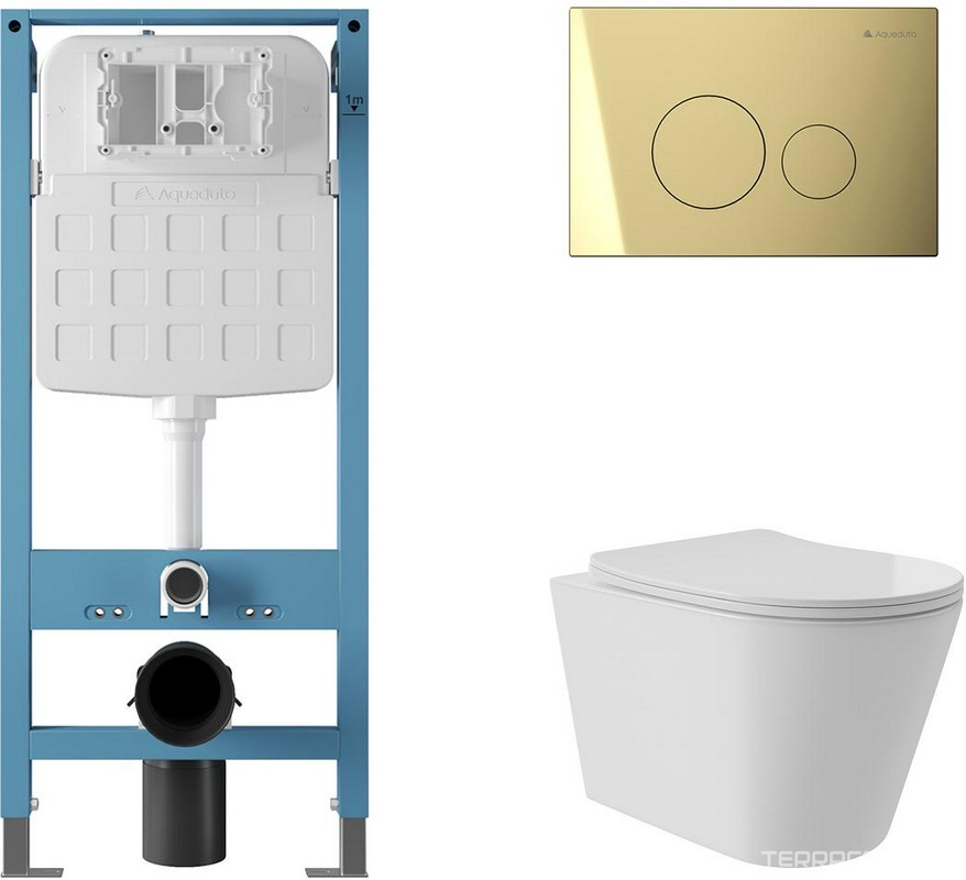 Компл.:унитаз подв.,безобод,Tornado 520х365мм,цв.белый гл,сиденье с микрол,инстал. д/унит,крепёж, клавиша смыв Circulo Novo цв.шл.золото, ZZ Aqueduto Cone Plus AQDS238T