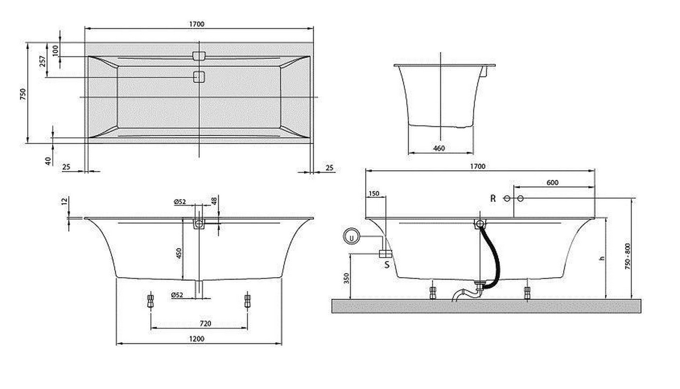 Ванна 1700х750хh450мм, прямоугольная, для встраивания (установка без панелей), без ножек арт.C895000 и слива-перелива, (акрил), Active ZZ