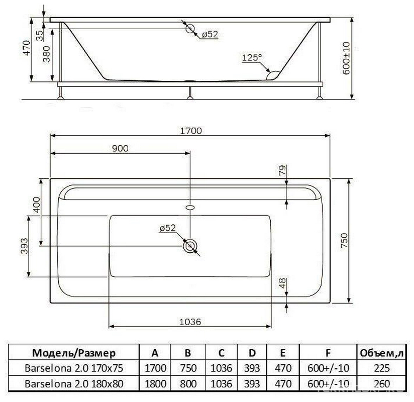 Ванна 170х75см, без ножек/рамы, панелей, слива-перелива, (акрил цв.белый), Barselona 2.0 ZZ